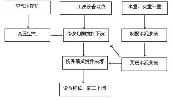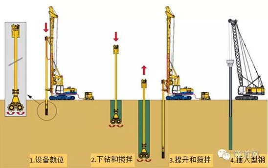 主要包括:清場備料→測量放線→安裝調試→開溝鋪板→移機定位 →銑、削下沉攪拌、噴漿→回轉提升噴漿→成墻移機→插入H型鋼樁