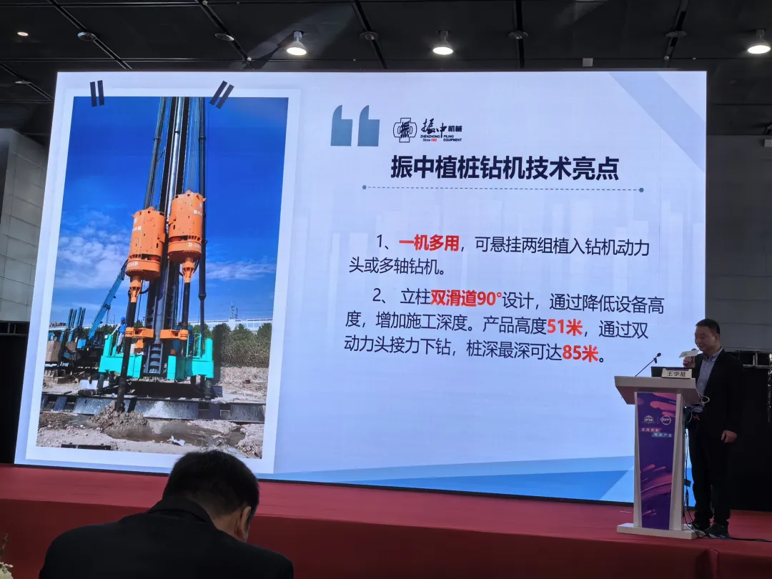 會上,振中機械營銷部總經理王學星作《溫州振中多功能植樁鉆機在靜鉆根植工法中的應用》專題報告,借助多功能植樁鉆機在各工程中的施工概況,深入淺出地講解其優勢、工藝與技術亮點,分享心得。